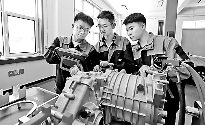 安徽省芜湖机械工程学校实训基地,学生在老师的指导下学习新能源汽车维修。肖本祥摄/光明图片