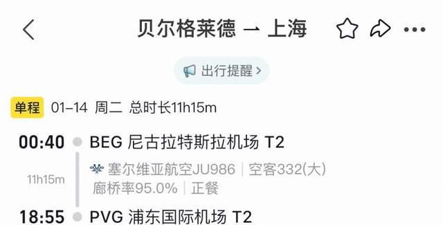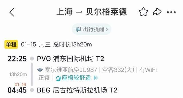 该航线由塞尔维亚航空的空客A330执飞,飞行时间在10 小时左右。