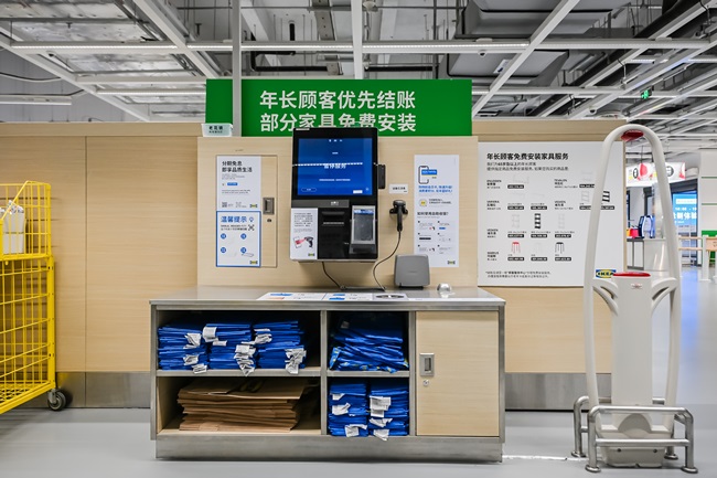 为了更好地服务年长顾客,商场在硬件设施和服务上进行了优化,旨在创建一个更加长者友好的购物环境,比如改造两处长者卫生间并提供专属收银台,提供指定商品免费安装服务;一楼服务台设置长者友好便民箱,提供老花镜、轮椅等物品,方便长者随时借用。