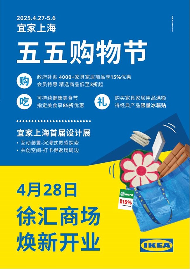 为庆祝焕新开业,4 月 23 日至 5 月 6 日,宜家徐汇商场以“转动蓝盒新灵感”为主题,打造300 平方米蓝色空间,在此,顾客可以一览不同时代的家居设计亮点,感受宜家的民主设计理念经久不衰的吸引力。结合上海“五五购物节”消费季主题,同时庆祝宜家徐汇商场焕新开业,4月 27 日至 5 月 6 日期间,宜家上海四店还将推出更具性价比的吃喝玩购一条龙,邀请广大消费者 “宜”起假日狂欢。在 5000 余款商品享受 15%上海政府补贴的基础上,300 余款热门商品叠加限时特惠,超值折扣最低 3 折起。