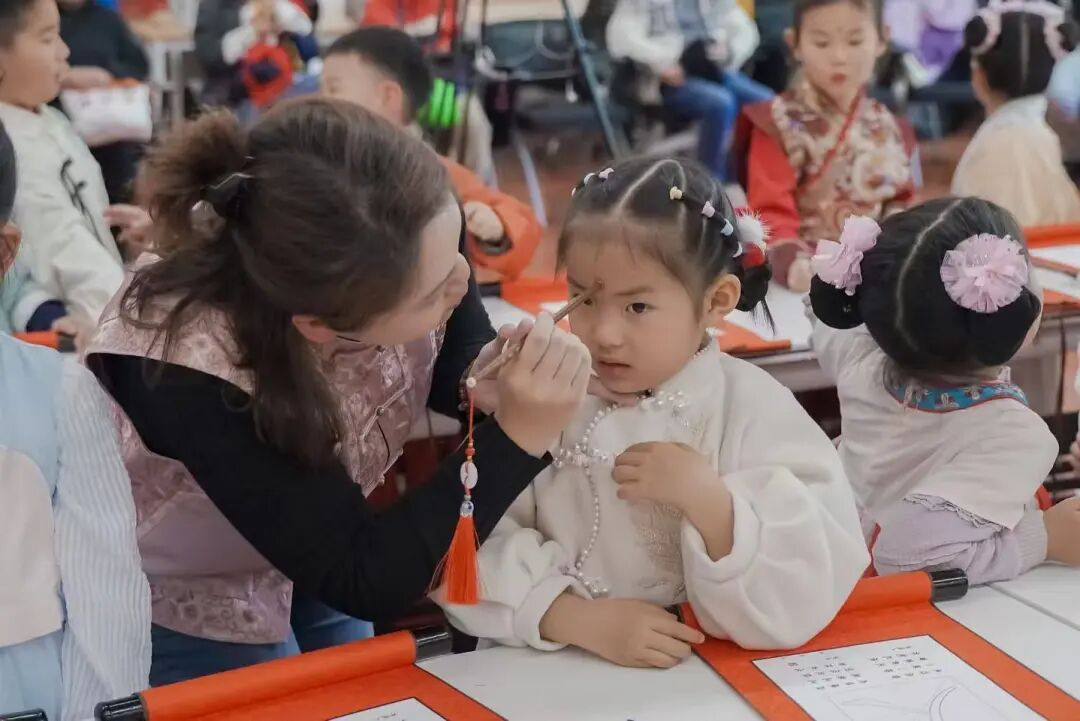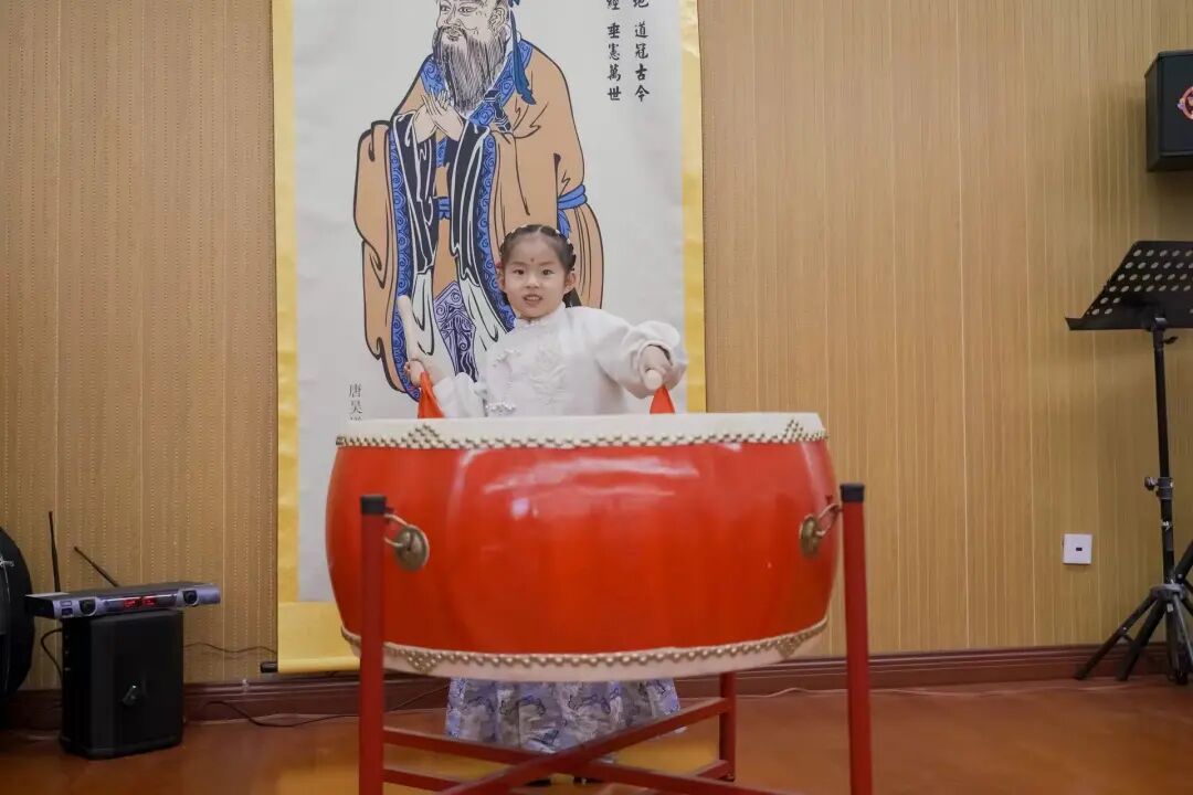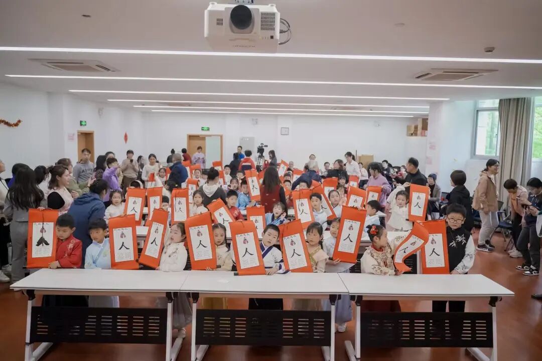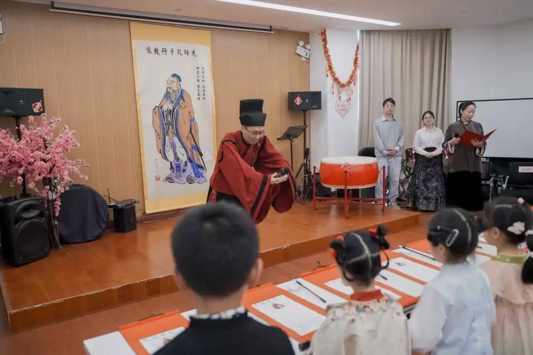最具仪式感与传统文化内涵的环节,当属“开笔启慧”仪式。活动特邀国学老师孔令韬先生,带领小朋友们循古礼、承文脉。仪式遵循七步古礼:正衣冠、敬先师、朱砂点智、击鼓明志、挥毫书“人”、诵读经典、奉茶谢恩,每一步都承载着启智明理的寓意。家长吴玮在现场深有感触:“现在街道和学校都很重视阅读,但平时在家里未必有这样的气氛和机会让孩子接触传统礼仪。学校和社区都可以多组织这样的活动,让小朋友了解国学文化。”